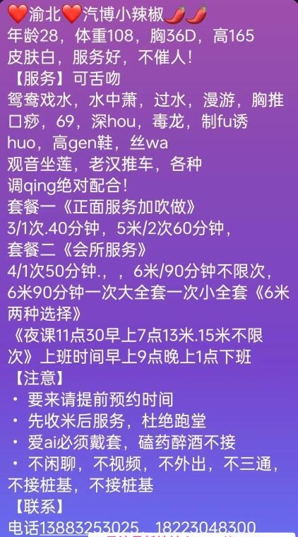 朋友推荐的渝北大奶妹子,身材确实不错,胸大腰细臀翘,皮肤白,整体比例挺好看。穿制服的时候很有感觉,清秀脸蛋带点娇羞。服务态度可以,全程陪洗比较细心。口活认真,小舌头舔得挺舒服,不敷衍。上床后配合度高,比较主动也敏感,水多下面紧,进去包裹感强,后入视觉和触感都挺带劲。整体体验真实,性价比还行,值得试一次。